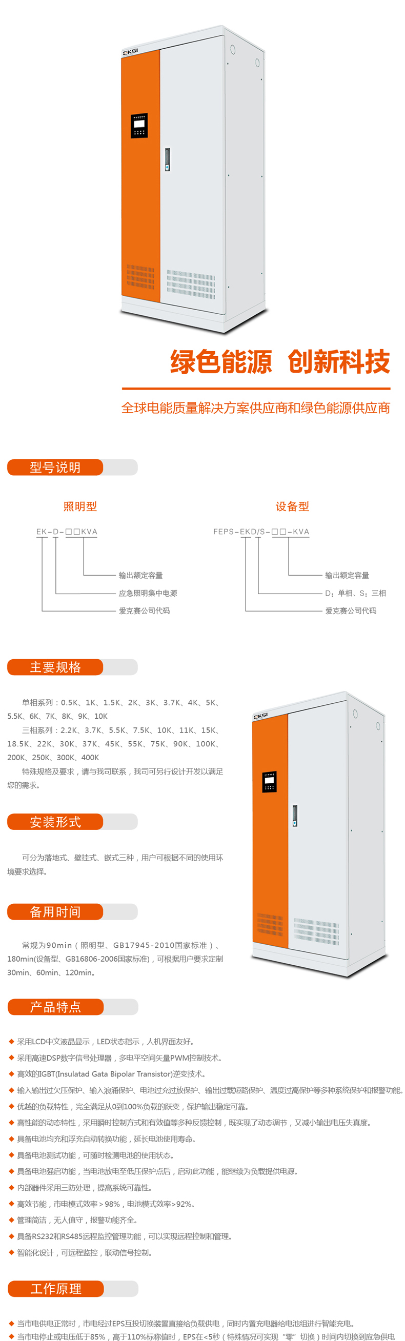 EPS:在電網(wǎng)正常時(shí)處于睡眠狀態(tài),耗電不足0.1%,無(wú)電網(wǎng)供電時(shí),其效率92%以上
